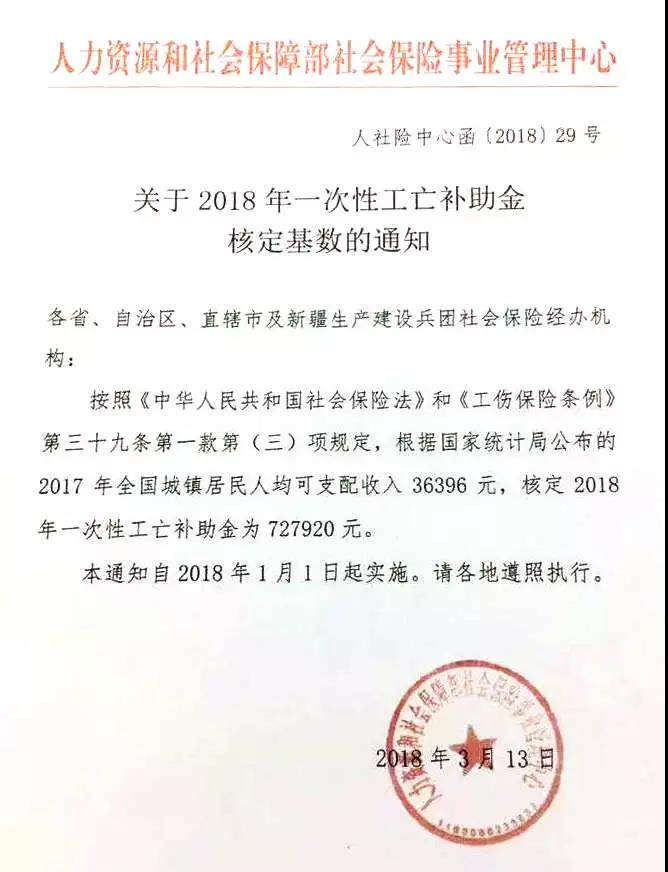 關(guān)于2018年一次性工亡補(bǔ)助金核定基數(shù)的通知