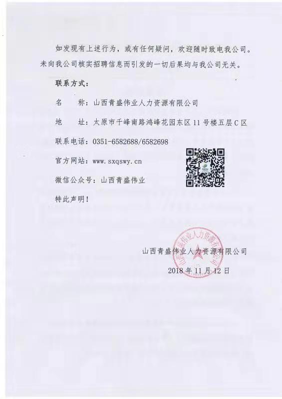 版權(quán)所有:山西青盛偉業(yè)人力資源有限公司 聯(lián)系電話:0351-6582688 地址:山西省太原市萬柏林區(qū)千峰南路鴻峰花園東區(qū)11號樓(雙創(chuàng)空間)五層C區(qū)