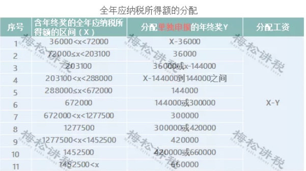 當(dāng)含年終獎(jiǎng)的全年應(yīng)納稅所得額大于36000時(shí),由于年終獎(jiǎng)單獨(dú)申報(bào)存在雷區(qū)等原因,為使稅負(fù)******,可在年終獎(jiǎng)和工資之間進(jìn)行分配,分配的年終獎(jiǎng)按照全年一次性獎(jiǎng)金單獨(dú)申報(bào)。