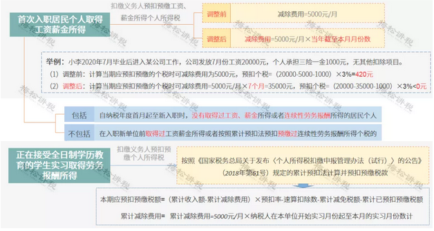 (1)自2020年7月起,首次入職居民個(gè)人取得工資薪金所得以及正在接受全日制學(xué)歷教育的學(xué)生實(shí)習(xí)取得勞務(wù)報(bào)酬,按以下方法計(jì)算個(gè)稅: